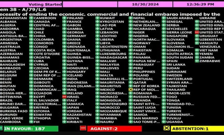Fue en la ONU, donde se aprobó un resolución que incita a los norteamericanos levantar el «bloqueo».