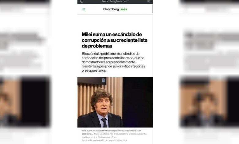 - Bloomberg Línea: Tituló que «Milei suma un escándalo de corrupción a su creciente lista de problemas», y advirtió que el caso podría mermar el índice de aprobación del Presidente.